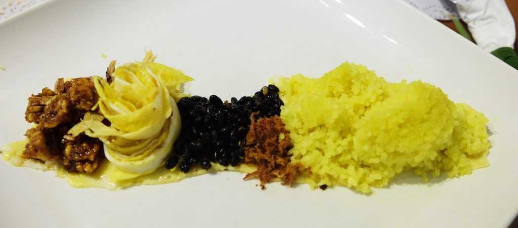 Hidangan pembuka merupakan karya Mella Jaarsma (1998), bertajuk “Pribumi – Pribumi”. Kaki kodok yang digoreng garing, disajikan di atas lembaran daun pisang nan eksotis. Hidangan berikutnya merupakan karya Agung Kurniawan (2013), berjudul “Masya Allah, Transgenik!!!”. Dalam piring, disajikan nasi kuning aromatik lengkap dengan telur dadar, kedelai hitam, kering tempe, abon, dan ayam suwir.